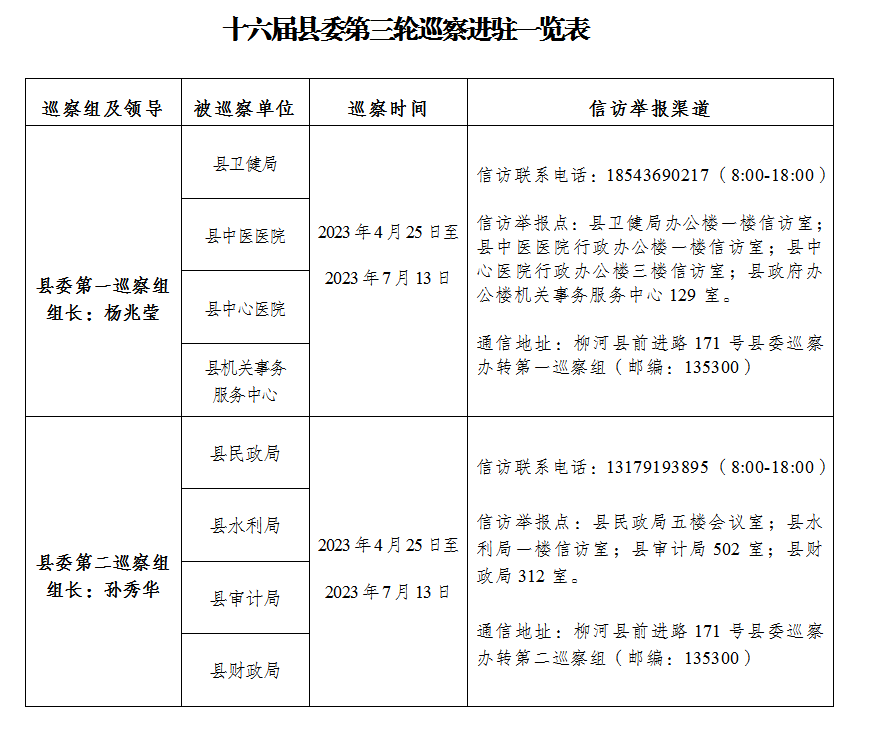 按照县委统一部署,县委成立2个巡察组对县卫健局党组、县中医医院、县中心医院、县机关事务服务中心党组、县民政局党组、县水利局党组、县审计局党组、县财政局党组开展常规巡察。根据工作职责,县委巡察组主要受理反映被巡察单位领导班子成员、下一级班子成员和重要岗位党员干部的问题举报,重点是违反政治纪律、组织纪律、廉洁纪律、群众纪律、工作纪律、生活纪律、中央八项规定精神和“四风”以及领导干部不担当不作为、群众身边不正之风等方面的突出问题。为便于干部群众反映问题和情况,现将十六届县委第三轮巡察各巡察组信访举报渠道公布如下: